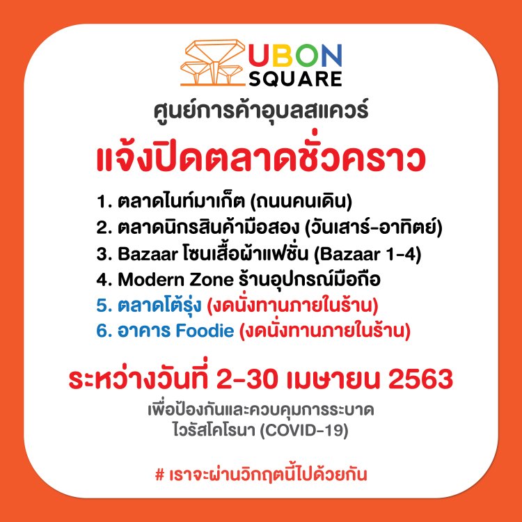 ศูนย์การค้าอุบลสแควร์ แจ้งปิดตลาดชั่วคราว